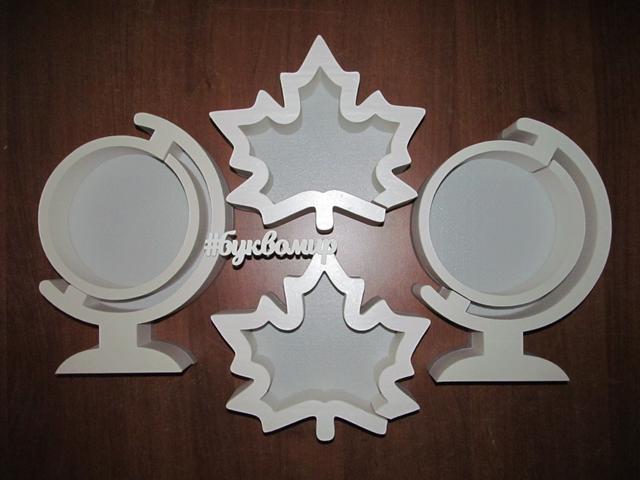 Пенобоксы ГЛОБУС и КЛЕНОВЫЙ ЛИСТ. Глобус высотой 30 см, кленовый лист высотой 25 см. На фото вариант без покраски. Полезная глубина 5 см