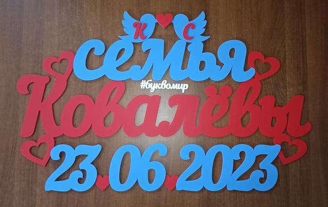 Индивидуальные надписи для свадебной фотосессии и украшения президиума. Выполнены из фанеры. 2 цвета покраски. Общие размеры изделия на фото 90*55 см.