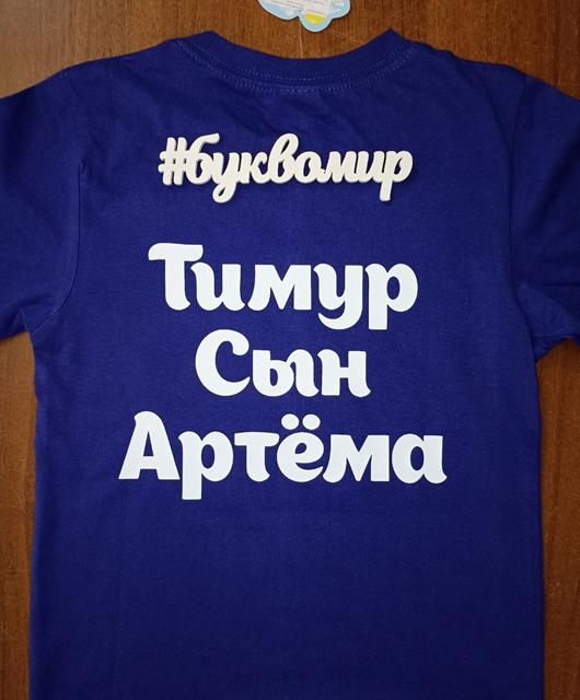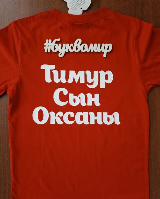 Нанесение текста на футболку клиента. Доступные цвета для нанесения на одежде: чёрный, белый, жёлтый, синий, красный, золото, серебро